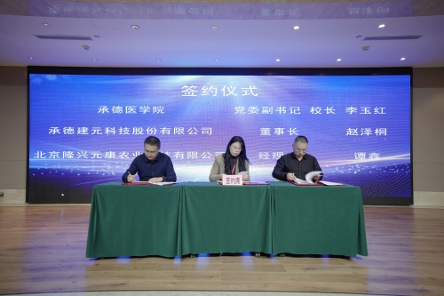 党委副书记、校长李玉红致欢迎辞 论坛现场举行了校企合作签约仪式。承德医学院与北京隆兴元康农业科技有限公司、承德建元科技股份有限公司共同签订了共建“大健康产业协同创新中心”的合作协议;同时,与河北雄安复泰智慧医疗科技有限公司、北京中企新动力标准化技术服务有限公司、北京古都医药有限公司3家企业分别签署了合作协议。协议的签署,标志着校企合作迈入实质性、系统化推进的新阶段,为构建产学研协同创新共同体奠定了坚实基础。