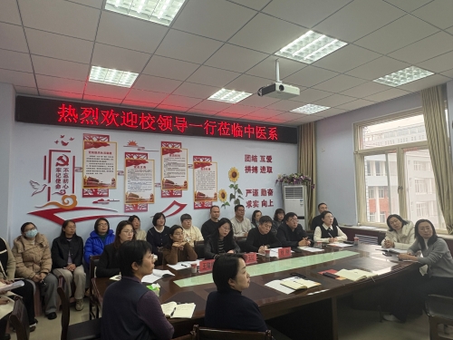 为深入贯彻落实国家中医药教育改革与高质量发展相关政策要求,紧扣执业医师资格考试核心导向,持续提升中医类专业人才培养质量与临床教学同质化水平,2025年12月10日,学校党委常委、校长李玉红一行到中医系,专题调研以执业医师考试为导向的中医类专业临床教学同质化工作。党委常委、副校长刘刚、王瑞婷及教务处、高等医学教研室等相关职能处室负责人陪同调研,中医系班子成员、教研室主任、辅导员及学业导师参加调研会议。
