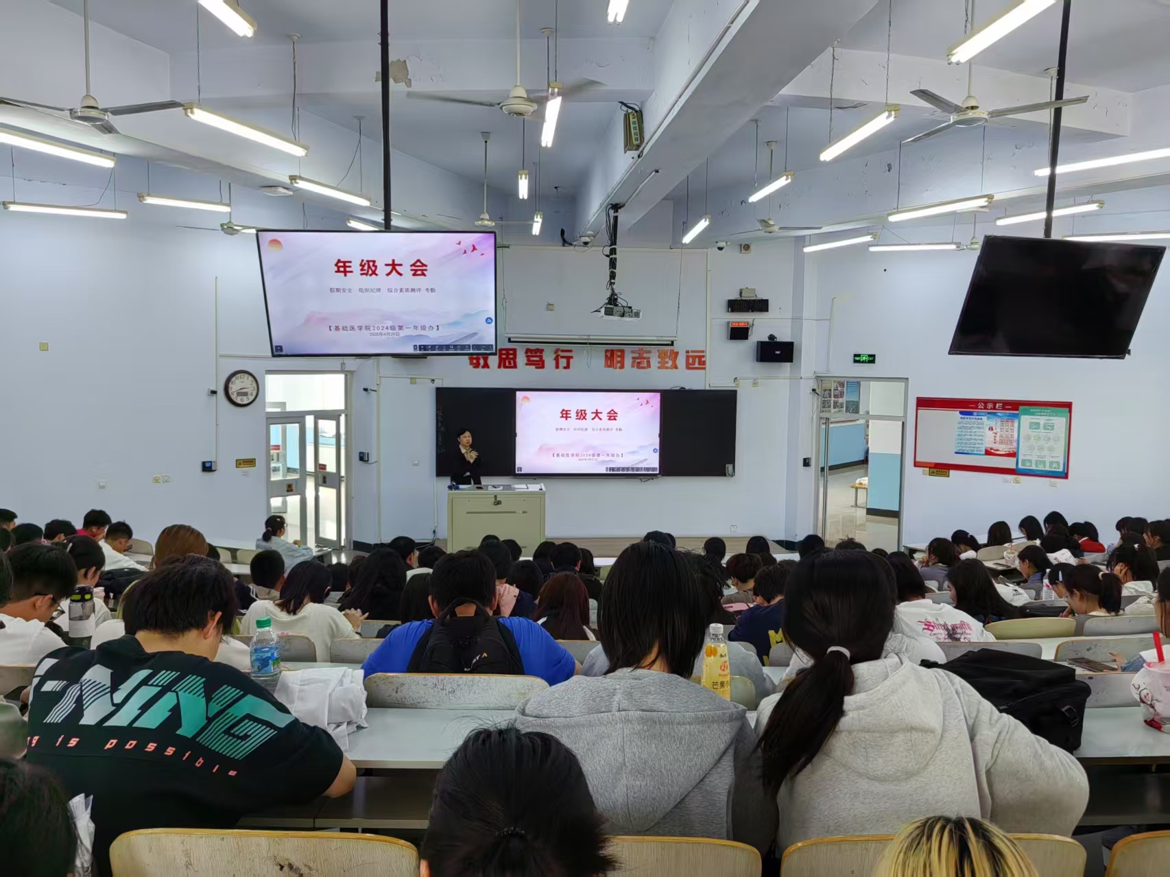 为了进一步加强学生日常管理,保障“五一”假期安全,明确纪律要求,基础医学院2024级第一学工办于2025年4月29日在405教室召开年级大会。基础医学院2024级临床医学专业全体学生参加。 筑牢安全防线,确保假期平安 会议强调了假期安全的重要性,重点提醒学生注意四个方面:一是五一假期期间留校生的水电安全,未离校学生要特别注意水电门窗,防止火灾隐患发生;二是交通安全警惕,杜绝乘坐非法营运车辆,遵守交通规则;三是防范网络诈骗,不轻信陌生信息,避免财产损失;四是注重心理调适,合理安排作息,保持积极心态。 (点击每张图片即可查看原图)