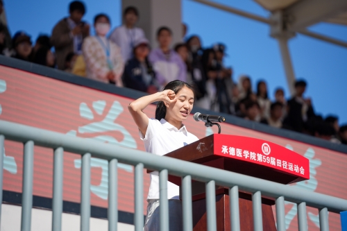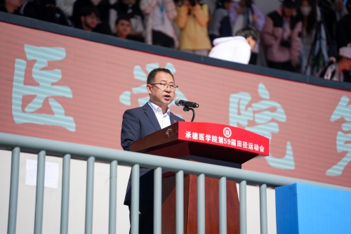 升旗仪式 第五十九届田径运动会组委会副主任、副校长郭玉成致开幕词。他代表学校领导班子向运动会的召开表示热烈祝贺,向全体工作人员、运动员和裁判员致以崇高敬意。郭玉成指出,学校牢固树立“健康第一”的教育理念,持续打造“健康承医、活力承医、奋进承医”的体育文化品牌。过去一年,学生“乐跑”年度总里程超60万公里,省级以上体育竞赛斩获9项奖项,充分展现了承医学子的昂扬风貌。他强调,体育是医学生贯穿成长与职业的必修课,希望同学们强健自身体魄,以“每日锻炼一小时”的自觉挣脱“体质短板”的束缚;锤炼职业素养,将赛场上奋勇争先的拼搏精神转化为钻研医术、坚守仁心的不竭动力;坚定理想信念,牢记“请党放心、强国有我”的青春誓言,以仁术护苍生,在健康中国建设中书写承医青年的璀璨篇章。