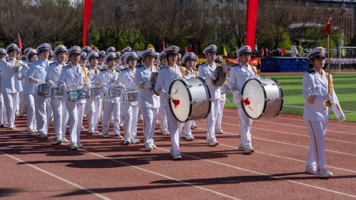 第五十九届田径运动会开幕式现场 军乐团奏响激昂的旋律,田径场上气氛高涨。仪仗队步伐铿锵、神采飞扬,高擎五星红旗与校旗率先步入会场。紧随其后,基础医学院2025级旗林队挥旗引路,各代表队方阵依次亮相:基础医学院2024级方队、基础医学院2023级方队步伐整齐,中医系方队气韵从容,中药心理生科联队方队沉稳有力,生物医学工程系方队特色鲜明,护理系一队、二队、三队方队英姿飒爽,研究生学院方队意气风发,教职工方队精神饱满,依次走过主席台。全场方队集结完毕,雄壮的国歌声响起,五星红旗冉冉升起,在全体师生的注目礼中迎风飘扬。