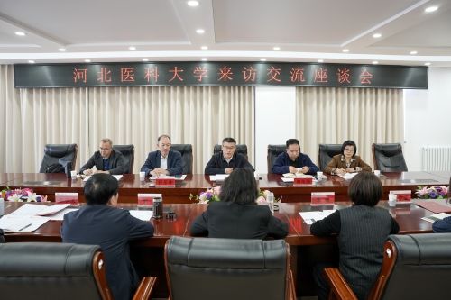 为深入贯彻落实河北省关于支持医学院校发展提升的工作部署,搭建院校交流互鉴平台,4月2日下午,河北医科大学党委书记于树江及相关负责同志莅临我校,在行政楼312召开专题交流座谈会。学校党委副书记、校长李玉红、党委常委、副校长刘刚及相关职能处室负责人参加座谈,会议由刘刚主持。 会议伊始,与会人员共同观看承德医学院宣传片,全面了解我校80年来的发展历程、办学成果与红色底蕴。
